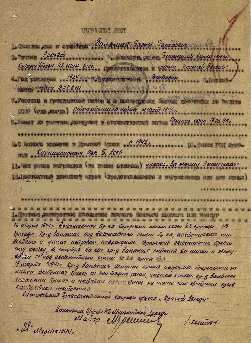 Приложение 5. (Наградной лист Залялиева Гарифа Гарафовича)